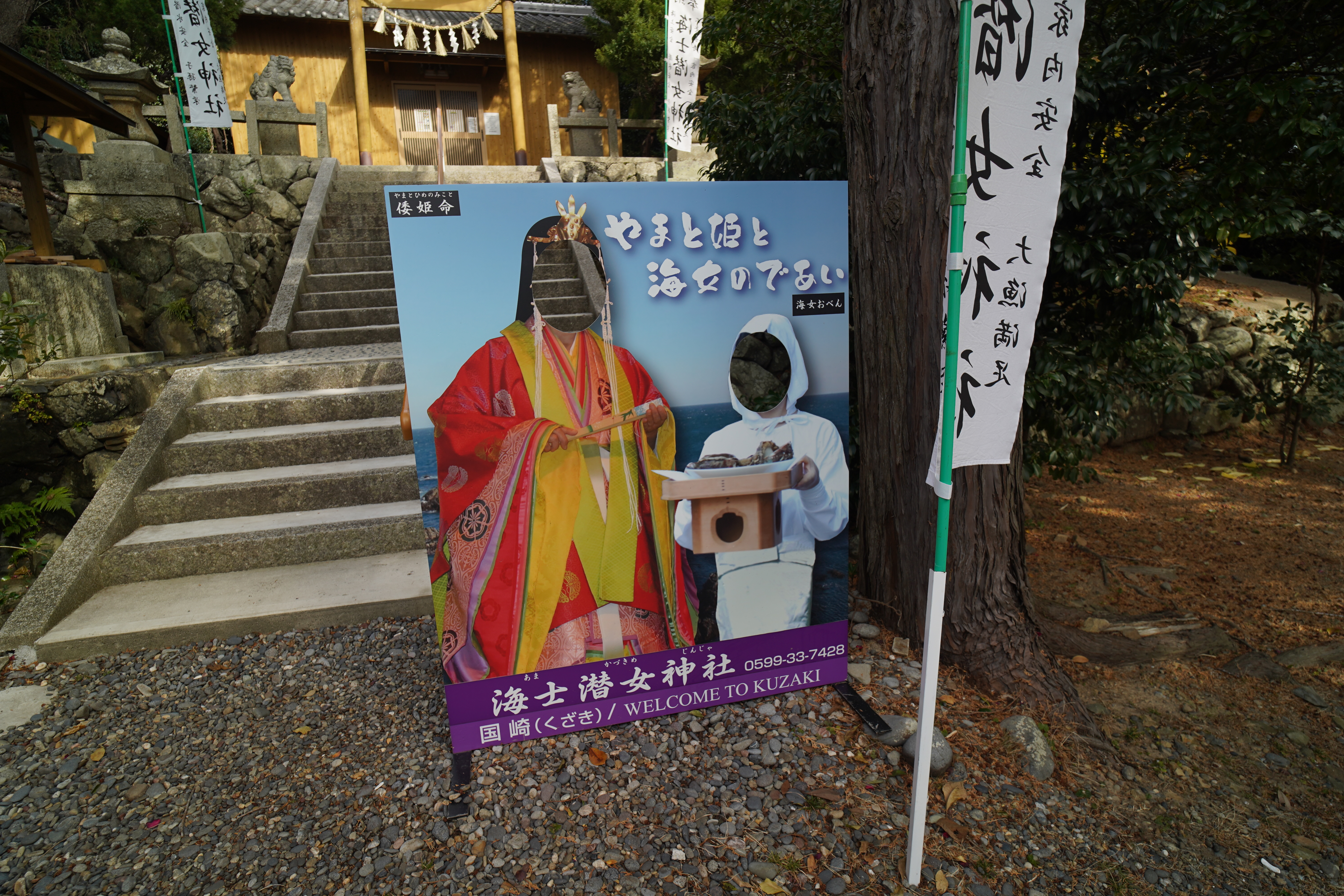 現在、鳥羽市国崎町には、伊勢神宮の鰒(アワビ)調製所があります。鳥羽市国崎町のアワビが伊勢神宮に奉納されるようになったのは、垂仁天皇の皇女・倭姫命が、天照御大神の御神饌を調製できるところを探されたとき、この地に「湯貴の潜女(ゆきのかづきめ・清らかな海女さんの意味)」を定められたことに由来するとされています。(『倭姫命世記』による。)『大和姫命世紀』の写真:MieMu 図録より