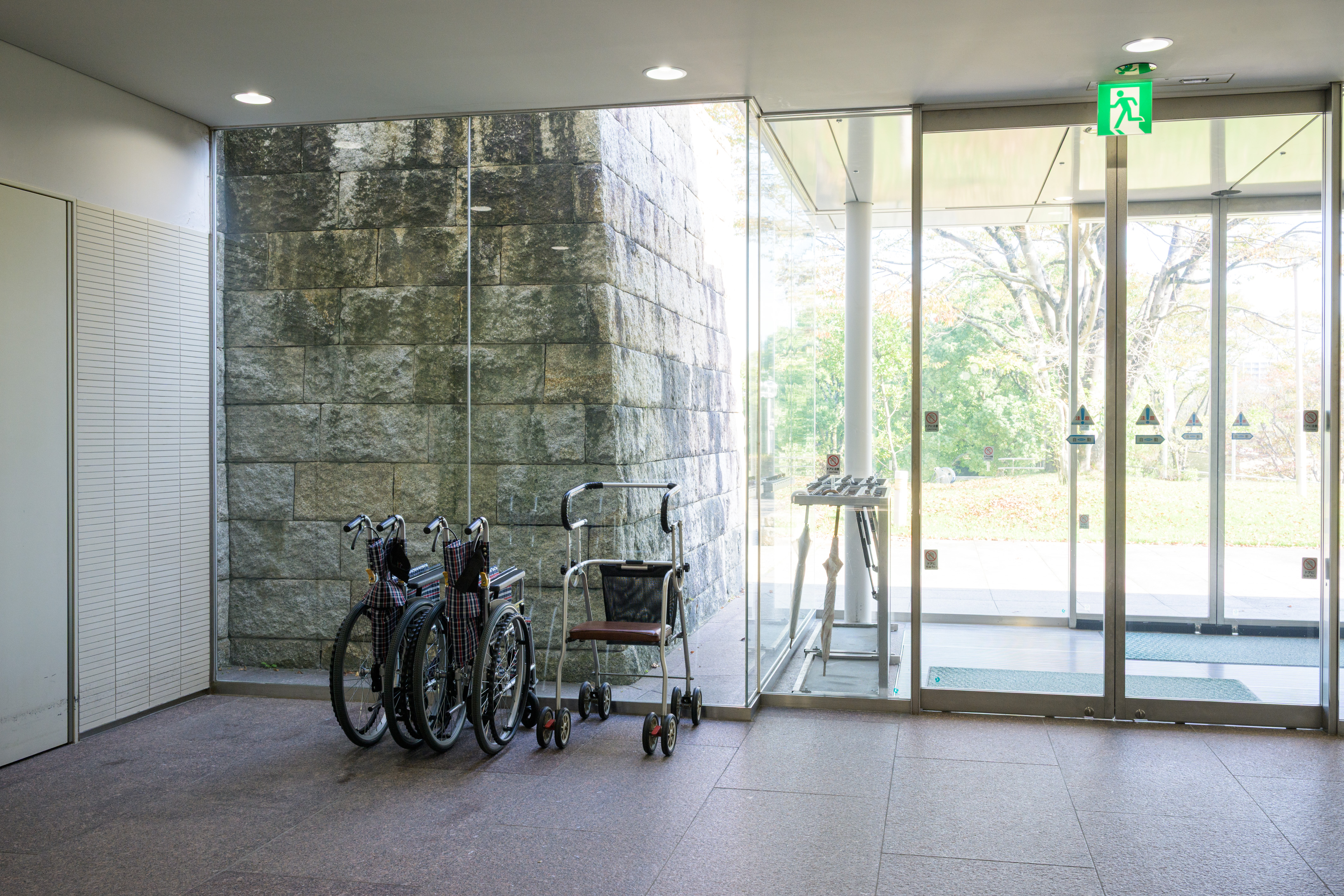 柳原義達記念館入口と正面玄関で車椅子やベビーカー、歩行器の無料貸出を行っています。車椅子は、正面玄関入って右手のインフォメーションでも貸出をしています。