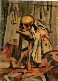 三重県立美術館には、現在、油彩画2点、素描1点、計3点の中村彝の作品が収蔵されている。ここでは、紙数の許す限り、これら3点につき紹介することとしたい。 1.「婦人像」1922年頃作 油彩・麻布 45.5×33.5cm この作品は、画面右下に3行にわたって、「192 2(ママ)/T.Nakamura/par photo-graphie」との記述があり、大正11年(1922)、彝35歳頃の筆による作品と考えられる。記述を信ずれば、写真を見ながら描いた作品ということになるが、その描写には、彝の他の人物画と比較した場合、確かにある種の生硬さが感じられる。表現方法の基調は、いわゆるルノワール風であるが、モデルの表情からは、冷たい能面のような印象が伝ってくる。モデルが誰であるのか不明であるが、病床にあった彝の、制作の有様を知る上で、興味深い作品ではある。 2.「髑髏のある静物」1923年作 油彩・板 35.0×25.0cm この作品には署名も年紀も無いが、彝没後の1925年(大正14)3月に画廊九段で開かれた中村彝遺作展に出品され、その翌年に刊行された『中村彝作品集』にも収録されている。全く同じ題名で、構図も酷似した、やや小型の作品が、他に一点残っている(中村彝展 No.90)。 本図は、大正12年9日1日の関東大震災の直前に描いたもので、画中の髑髏は、多潮実輝の好意により一高の生物学教室から借り出したものであるという。古来、死および死すべき運命のシンボルであった髑髏が、なぜこの時期に病身の彝によって静物画のモチーフとして用いられたのか、その真相は明らかでない。しかし、翌年暮に迫った彼の死を考えると、本図は、ある種の憶測をさそう作品ではある。 この作品以後、彼の関心は静物画へと向い、「カルピスの包み紙のある静物」、「向日葵」、「花」などの秀作が制作きれることになる。 3.「自画像」1922年頃作 木炭・紙 29.0×24,4cm 中村彝は、岸田劉生と並んで、最も多く自画像を遺した洋画家の一人であり、「帽子を被る自画像」(1910年作)、「自画像」(1916年頃作)、「髑髏を持てる自画像」(1923-24年作)など、初期から時期を追って優れた作品がある。素描にも1915年作の2点を初めとして、髭をはやした、眼の大きい、いかにも個性豊かな芸術家を髣髴させる、生き生さとした筆致の作品が残っており、本囲もそうした作例の一つである。 (もうり・いちろう 学芸員) |