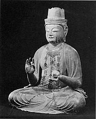 | 59 ◎大日如来坐像 木造 l躯 像高89.5 平安時代 10-11C. 津市 蓮光院 津市の中心部に位置する蓮光院は、真言宗御室派に属し、寺伝ではかつては近くの四天王寺の子院であったとも伝えられる。当寺は、戦見などで伽藍などは焼失してしまったが、幸い平安期の彫刻が2体残っている。 本像は、胸前で智挙印を結んだ金剛界の大日如来である。本像の詳しい伝来は明らかでないが、各所に巧みな彫技が見られ、後補部分も少なく、鈴鹿市・妙福寺の大日如来像とともに、この地方に残る密教彫刻の優れた作例として注目される。 ヒノキを使用し、頭部と体部の主要部は一材から彫成し、脚部と両肩・臂・手首から先は別材製で、像底から内刳りが施されている。当初は彩色されていたと考えられるが、現在では殆ど剥落し、僅かに唇に朱が認められるのみである。また、腕釧・臂釧は、銅板打出し製である。なお、当初の光背・台座は失われている。 像は、条帛と裳を看けて、智拳印を結び、右足を外に結跏趺坐する。大きく張った顎と、豊かな頬、目尻の上がった眼の形や、脇を開いて腕を張った体躯の造りなど、各部に平安初期彫刻を思わせる古様な表現が見られるが、それらは、手慣れたノミ使いを示して、やや初発性に欠け、その造立年代は、平安時代中期頃に下ると考えられる。 |