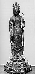 | 73 地蔵菩薩立像 木造 1躯 像高142.0 鎌倉時代 12-13C. 伊勢市 金剛証寺 本像は、下半身に丈の短い裙をまき、上半身は裸体という半裸の地蔵菩薩で、鎌倉時代に盛行した裸形像の一種である。構造は、ヒノキ材製で、頭体主要部は竪一材から彫出し、両腕は、肩・臂・手首でそれぞれ矧いでいる。肉身部は、漆箔を施し、裙には剥落が著しいが、彩色の跡を見ることができる。なお、当初の持物および光背・台座は失われている。 像容は、胸飾(後補)を着け、右手を軽く屈して腰のあたりに置き(もと錫杖をもっていたと考えられる)、左手は掌を上に宝珠を取って、下半身に腰布状の短い裙を巻いて、直立している。頭部は、いわゆる比丘形で、頬の豊かな顔面に眼鼻立ちを大きく配している。喘正な顔立ちや、胸から腹にかけての柔らかな肉付け、簡略化された衣の表現などは、本像が藤原彫刻の遺風を遺す鎌倉初期の制作であることを示している。 鎌倉時代は平安時代後期に引き続いて、現世利益的な性格の強い地蔵菩薩が盛んに信仰された時代で、この時期に制作された地蔵像の遺品は非常に多く、本像もそうした平安時代末から鎌倉時代にかけての地蔵信仰の隆盛を背景にしているが、彫刻史的に興味深いのは、本像が、鎌倉時代に集中して造られた裸形像に属する点である。裸形像には、奈良・伝香寺の地蔵菩薩立像のような全裸像と、本像のような半裸像とがあり、これら裸形像は、その上に実物の袈裟などを着けることを前提としている。裸形像の起源については、これを鎌倉時代の彫刻が持つ現実主義的な傾向に求める説や、中国宋代彫刻に求める説、あるいは神像彫刻からの影響を想定する説もあって、定説は無いが、本像もこうした鎌倉期の裸形像の貴重な作例の一つである。 なお、金剛証寺では、本像を「矢負地蔵」と呼び、信者の身代わりになって、矢を負う地蔵菩薩として、尊崇している。 文献 田辺三郎助「金剛証寺地蔵菩薩像について―着装像の一例として」『大和文化研究』66 |