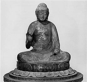 | 53 ◎如来坐像 銅造 1躯 像高 16.8 平安時代 10C. 志摩郡 和具観音堂 飛鳥時代から奈良時代にかけて流行した金銅仏は、平安時代に入ると、あまり制作されなくなり、現存作品の数も非常に少なくなる。本像は、金沢市伏見寺の阿弥陀如釆坐像とともに、数少ない平安時代前期を代表する金銅仏の作例として知られている。 かつて火中したために、右腕の肘から先が欠失し、また表面の鍍金もほとんど失われている。失われた右手は、あるいは近年発見された兵庫県・遍照院の如来坐像のように、屈臂して一種の施無畏印をとっていたのかもしれない。 像容を見ると、左手を膝上に置き、掌を上にした一種の与願印をとり、左脚を外にして結跏趺坐している。高さ20センチ足らずの小像にもかかわらず、堂々とした迫力に満ちている。大振りの肉髻、大形の耳朶、大きな目鼻立ちの配された豊頬の顔面、丈の高い膝頭、首が短くやや猫背気味の体躯、細部にこだわらない衣文表現等々、各所に平安前期の彫刻らしい力強い造形的な特徴が現れている。 鋳造は、飛鳥時代以来の金銅仏と同じ(ろう)型によるもので、肉厚は各部分ともほぼ平均している。また、鋳造時には、中心部に鉄心を貫入していたようで、頭頂部には、長円形の抜き去られた鉄心の跡が残っている。 本像の詳しい伝来は明らかではない。和具観音堂は、志摩国分寺とともに志摩半島を代表する古寺で、現在も、この地方の人々から多くの信仰を集めている。同寺には、文化財も多く、本像のほかに、平安時代後期の作と思われる丈六仏の頭部や、十一面観音立像(いずれも県指定文化財)などが残っており、この寺の由緒の古さを伝えている。 文献 倉田文作「平安時代の金銅仏」『MUSEUM』215 昭和44年。 |
