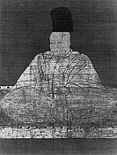 | 74 ◎俊乗上人坐像 木造 1躯 像高81.2 鎌倉時代 13C. 阿山郡 新大仏寺 治承4年〈1180)に平重衡の南都焼き打ちによって大きな打撃を受けた東大寺復興の大勧進職として活躍した俊乗坊重源の肖像である。重源の肖像は、本像の他、奈良・東大寺、兵庫県・浄土寺、山口県・阿弥陀寺など重源ゆかりの諸寺に数体が残っているが、この新大仏寺像は、それらのなかでも優れた作として知られている。 本像は、ヒノキの寄木造りになり、頭部は顔面で矧いで、玉眼を嵌入し、体部は、前半を一材,後半を左右二材から彫り出し、両足部・袖・手先などに、別材を寄せている。表面には、布貼りの上、彩色を施し(現在の彩色は後補)、像内も丁寧に内刳りして布貼りする。 像容は、袈裟に衲衣、裳を着けて坐し、両手は腹前に置き、左手を外にし、右親指を左手で包むような印相を結んでいる。容貌は、他の重源像と同様、老人の相を示し、額や目尻・首筋には深い皺を刻む。口をへの字に固く結び、遠くを見詰めるような眼差しは、この高僧の強い意志をリアルに伝えている。猪首のように前方に突出した太い首や、異様に突き出した後頭部の表現、あるいは左削こ対して右目を大きく表すなど、重源の容貌を良く知った仏師の作になることを推察させる特徴が各所に認められ、こうした真に迫る写実的表現が、この像に大きな存在感を与えている。 重源は、建永元年(1206)、86歳の高齢で没している。本像を初めとする重源像の制作時期や作者については、確実な史料に欠けるため、不明な点が多く、この新大仏寺像も例外ではない。制作年代は、本像よりもやや年が若い山口・阿弥陀寺像、あるいは更に進んだ老相を示す奈良・東大寺像との比較から、木像を重源82,3歳頃に造立されたとする説の他、80歳の寿像と見る鋭もあって、断定し難い。また、作者についても、重源と関係の深かった快慶を想定する説もあるが、推測の域を出か、。このように、不明な点は多いが、いずれにせよ本像は迫真的な写実表現になる鎌倉時代肖像彫刻の傑作として、価値は高い。 文献 小林 剛「俊乗坊重源の肖像について」『仏教芸術』23 昭和29年。 小林 剛『俊乗坊重源の研究』昭和46年。 三山 進「寿像と頂相彫刻」『MUSEUM』295 昭和50年。 井上 正「肖像彫刻の一系列―僧侶肖像とその脈流」『日本の肖像』昭和53年 中央公論社。 |