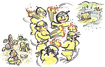 火の叩きあいは、たいまつを補給(ほきゅう)する役やはだかの男に水をかける介添(かいぞ)え役もついて盛大(せいだい)に行われてな。火の粉や歓声(かんせい)が飛びかうなか、盛(も)り上がりも最高潮(さいこうちょう)に達すると、今度は境内のどんどに勝ち組によって火がつけられる。鐘や大太鼓も打ち鳴らされ、勢いよく燃えあがる火が落ちるとともに祭りが終わるのや。
