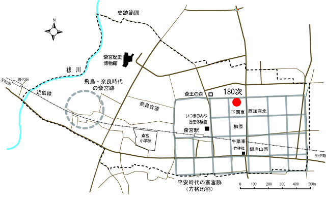 5月25日から、史跡斎宮跡北東部で第180次調査を行っています。調査地は平安時代斎宮跡の方格地割の北辺部「下園東(しもぞのひがし)区画」に位置しています。周辺からは等間隔に並ぶ5間×2間の建物群が確認されており、今回の調査でもこれらに続く建物を確認する目的で行いました。